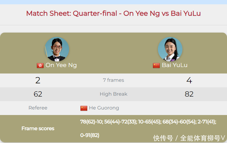 最终的冠军战,白雨露的敌手是泰国的世锦赛冠军、现天下名挨次一的明克-努查鲁特,后者在半决赛以5-1校服斯里帕蓬。这场决赛,白雨露经由十局较量,总比分6-4夺得冠军。
