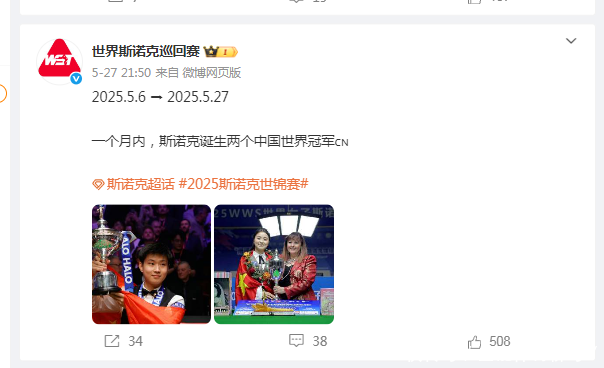 值得一提的是,白雨露夺冠之后,再次将中国斯诺克军团的合座发挥推向新的台阶。关于白雨露的这个冠军,天下斯诺克巡回赛官微写谈:“2025.5.6-2025.5.27,一个月内,斯诺克出身两个中国天下冠军。”
