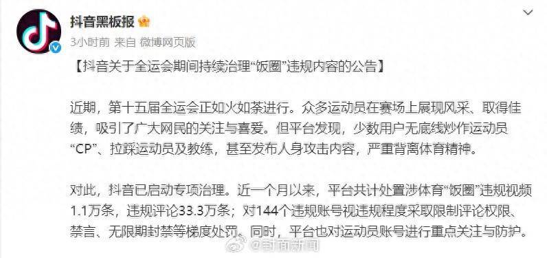 近期,第十五届全运会正热火朝天进行。繁密通顺员在赛场上展现风姿、赢得佳绩,眩惑了广泛网民的海涵与爱重。但少数用户在外交平台上无底线炒作通顺员“CP”、拉踩通顺员及教师,发布东说念主身挫折骨子,严重背离体育精神。近一个月以来,短视频平台整个处分涉体育“饭圈”违章视频1.1万条,违章研讨33.3万条;对144个违章账号视违章进度接管实现研讨权限、禁言、无穷期封禁等梯度处罚。同期,平台也对通顺员账号进行要点海涵与贯注。